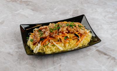 Zeljna juha, pečeni stekleni rezanci s piščancem ali s tofujem in zelenjavo